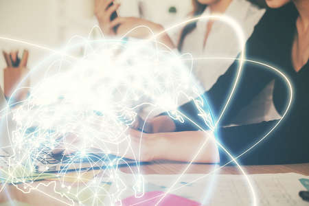 Double exposure of man and woman working together holding and using a mobile device and brain hologram drawing.