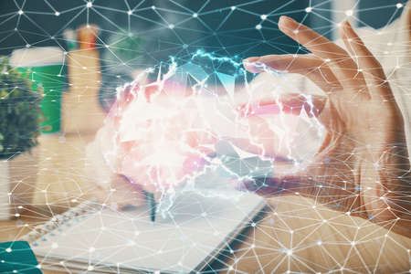 Multi exposure of writing hand on background with brain hologram. Concept of learning.