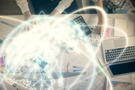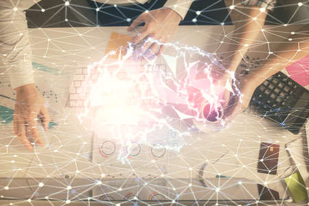 Double exposure of man and woman working together and human brain hologram drawing. Brainstorm concept. Computer background. Top View.