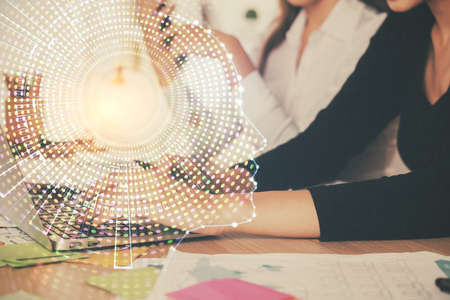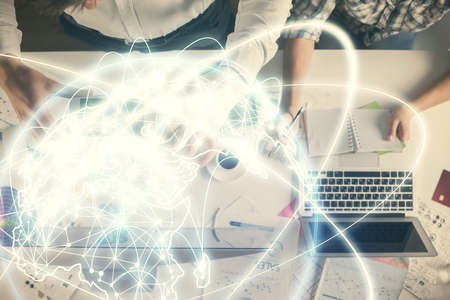 Double exposure of man and woman working together and creative hologram drawing. Computer background. Top View. Start up concept.