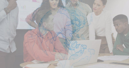 Collaborating professionals standing around table in office, with laptop tablet world map overlay. Teamwork, innovation, communication, digital, networking, brainstorming, multinational