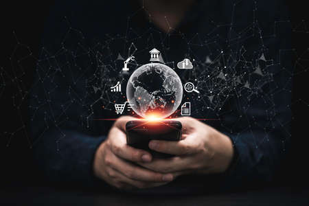 global network concept,Businessman holding global network connection on smart phone strategy and smart intelligence, digital marketing, Technology and global business.