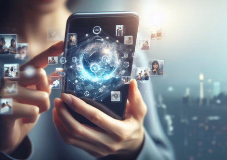 People using mobile phones with holographic graphics on internet communication technology, generative AI