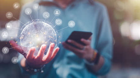 Women are using smart phone to do online transactions with internet technology, Online marketing, Data searching, Internet of things, Concept of global data connection by internet technology.