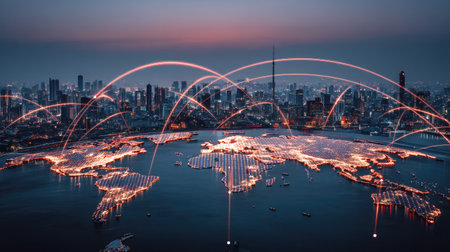 A glowing world map with interconnected cities and ports at sunset. Clear details and vibrant colors enhance ...