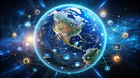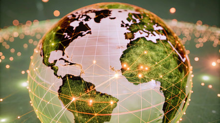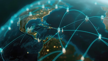 A 3D rendering of a global network, with interconnected nodes and digital communication lines.