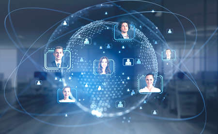 Creative glowing blue globe hologram with faces on blurry background. Hire, alumni, online conference and search concept. 3D Rendering