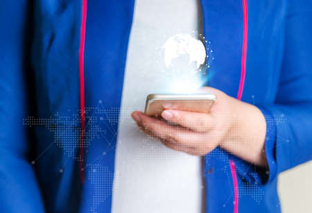 Hand holds mobile smart phone, worldwide connection and social network concept. Smart business concept.