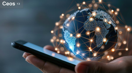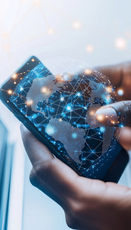A person's hands are holding a smartphone with a digital network illustration in front of the screen. The background has a dark blue color with blurry orange and white lights.