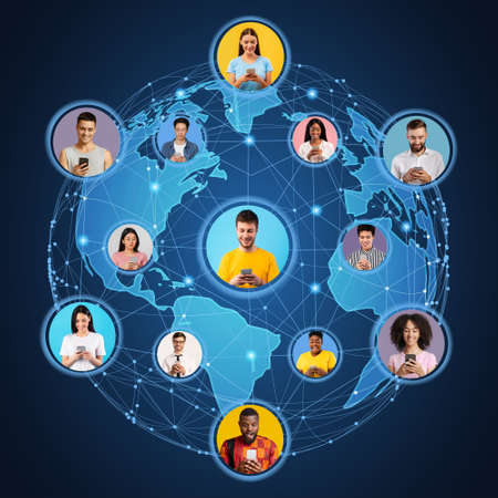 Global Network. Diverse Multiethnic People Using Smartphones Layered Over Abstract World Globe