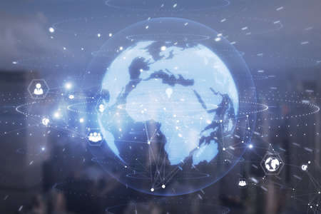 Creative bright globe interface with various business icons and connections on blurry city background. Global network and technology concept. double exposure