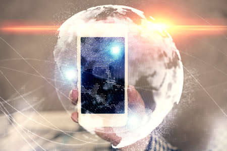 Double exposure of abstract creative programming illustration with world map and hand with cellphone on background, big data and blockchain concept