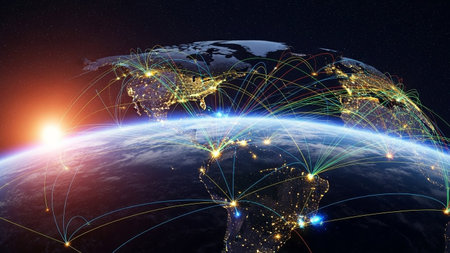 A stunning visualization of a global network with illuminated connections representing the digital communication across continents and countries.