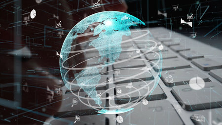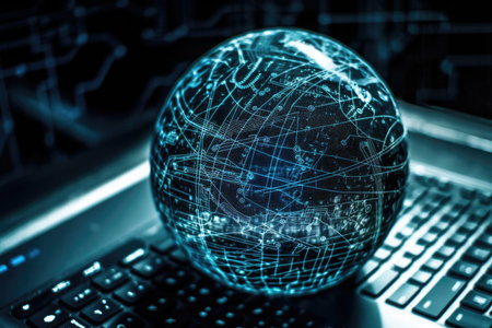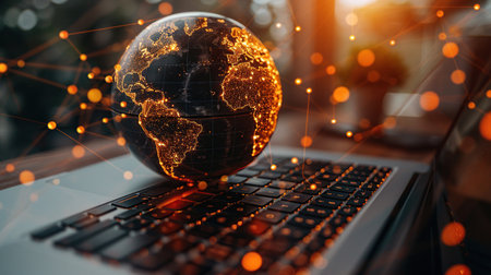 Modern digital globe with data visualization elements on a keyboard, illustrating the intersection of technology, business, and global information exchange.