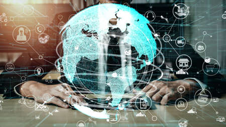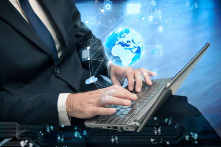 businessman worker are working online with laptop, graphic of communication network and cyber space connection, concept of online marketing