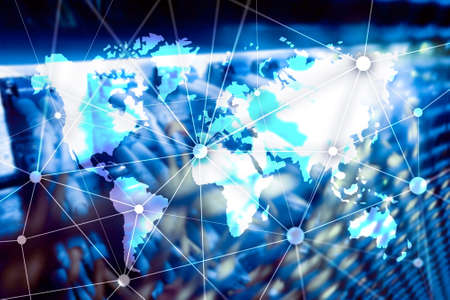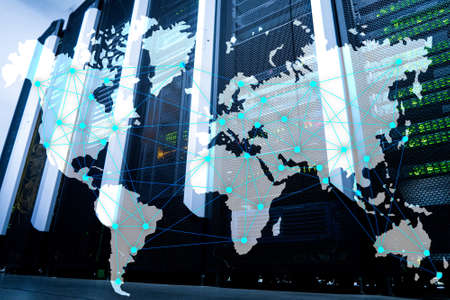 Internet and telecommunication concept with world map on server room background.