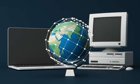 Vibrant illustration of a global network connection. The image features a stylized representation of the Earth, intricate lines and glowing elements, and a laptop screen displaying code. The colors are primarily blue and purple, creating a dynamic and futuristic atmosphere. The image has a strong digital and technology theme.