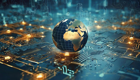 A tiny globe sits atop a circuit board, symbolizing global technology