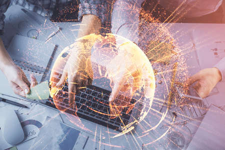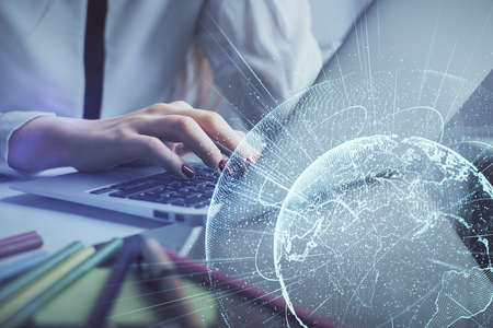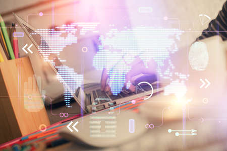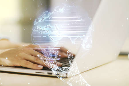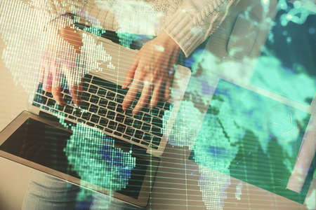 Double exposure of woman hands working on computer and world map hologram drawing. International technology business concept.