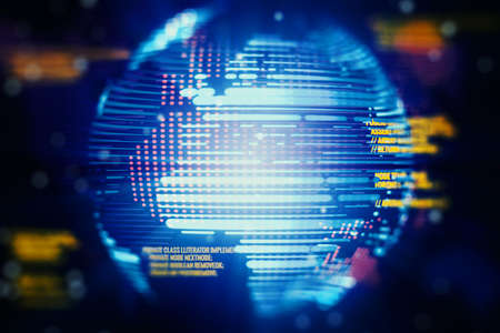 Abstract creative coding illustration with world map on modern computer background, international software development concept. Multiexposure