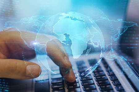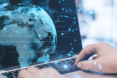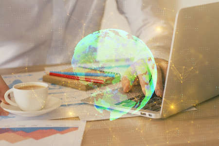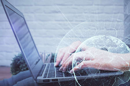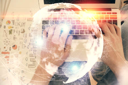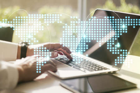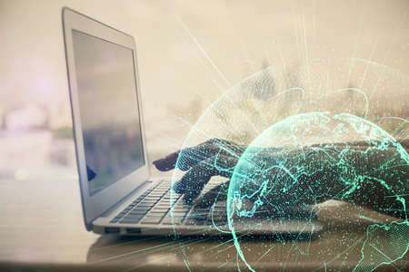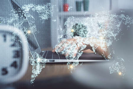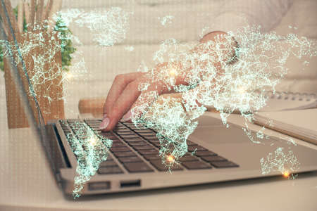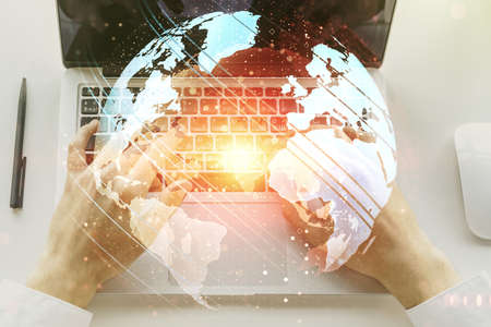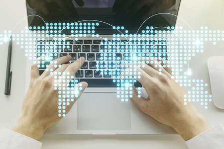 Abstract creative digital world map and hands typing on laptop on background, globalization concept. Multiexposure