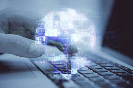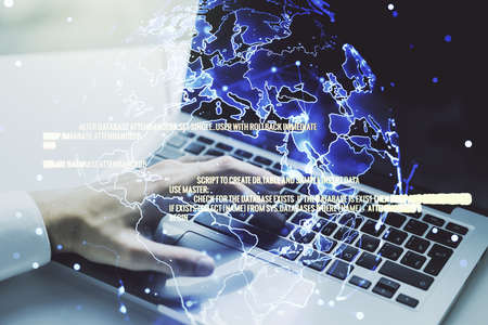 Multi exposure of abstract graphic coding sketch with world map and hands typing on computer keyboard on background, big data and networking concept