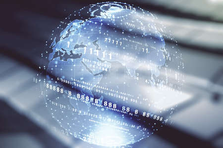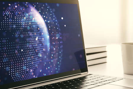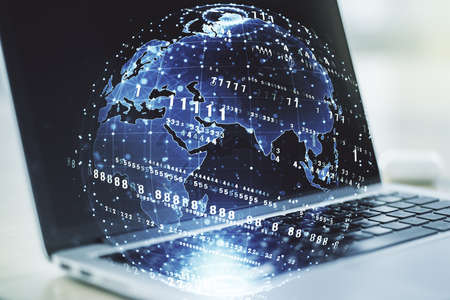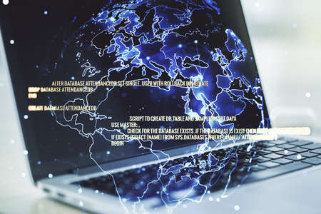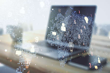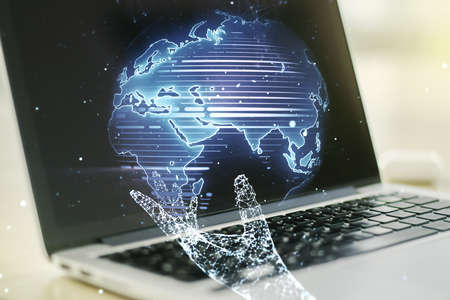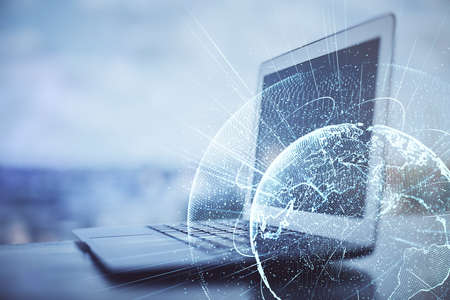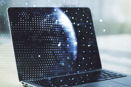 Close up of laptop computer on desktop with abstract digital social globe grid hologram on blurry background. Technology, data, information and connection concept. double exposure