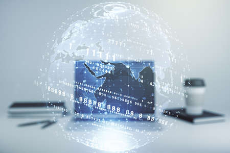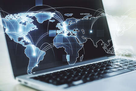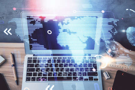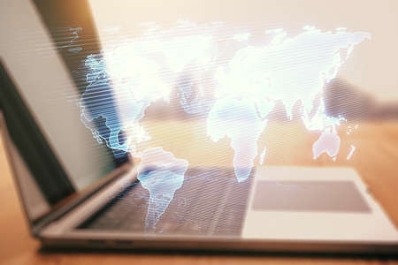 Abstract creative world map on modern laptop background, international trading concept. Multiexposure