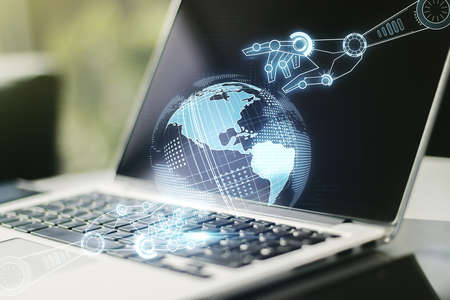 Creative concept of robotics technology with globe sketch on modern laptop background. Robot development and automation concept. Multiexposure