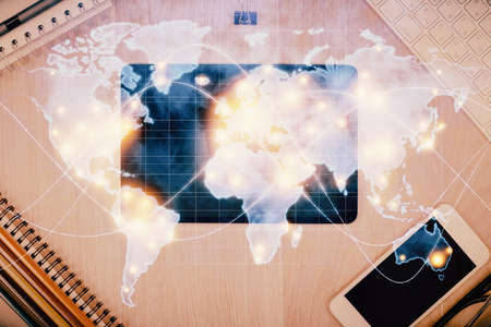 Double exposure of business theme hologram over desktop with phone. Top view. Mobile international trade connection concept.