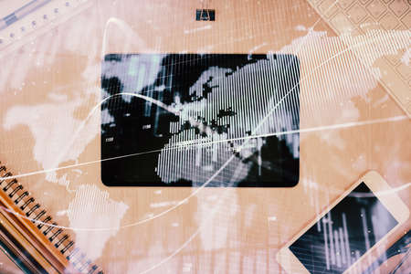 Double exposure world map. Global business and financial market concept.