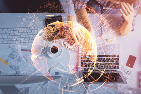 Multi exposure of technology theme drawing over work table desktop. Top view. Global data analysis concept.