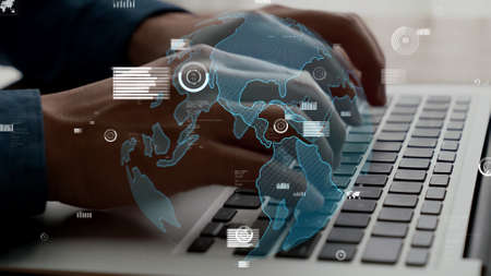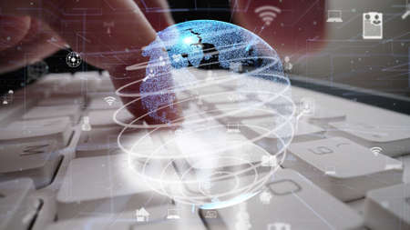 A close-up of hands typing on a keyboard, overlaid with a digital globe, symbolizes global connectivity and data interaction in a modern office setting.