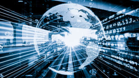 Futuristic global social media, people network and tacit digital data sharing . Concept of smart digital transformation and technology disruption that changes global trends in new information era .