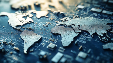 A world map formed from intricate circuit boards and chips reflects the blend of technology and global interconnectedness in today's society.