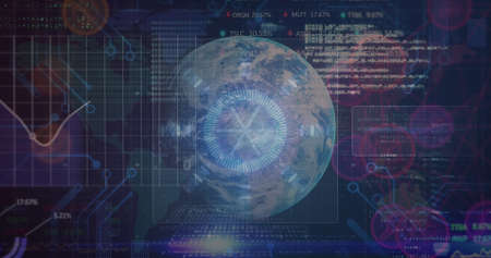 Image of diverse data processing over globe. global connections, technology and digital interface concept digitally generated image.