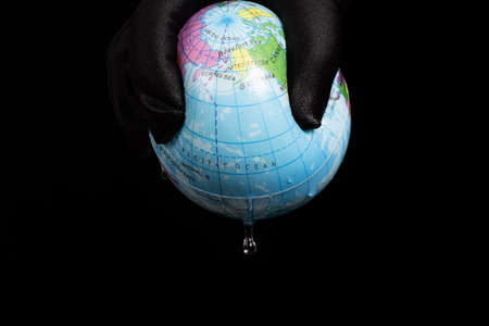 squeezing a globe and the last bit of water dropping down concept of human overusing the water resource