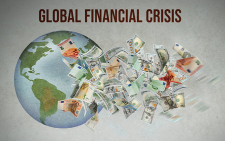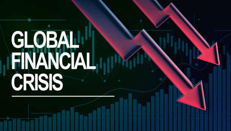 Image of Financial Crisis text with red line descending, American dollar sign falling and breaking over cityscape and banknotes. Global finance business economy concept digitally generated image.