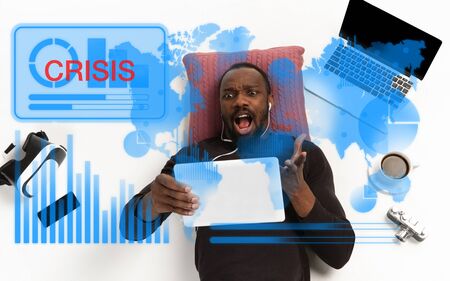 Interface modern technology and digital layer effect. Man counting, working in despair, went bankrupt. Business, finance crisis, economics recession, unemployment concept. Analyzing, neon icons.