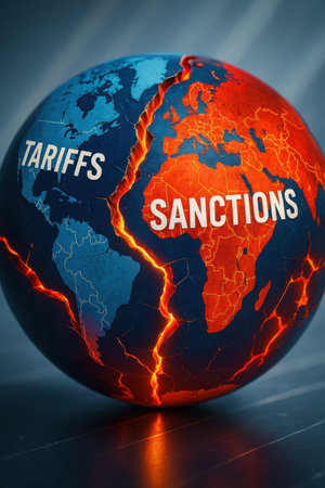 Globe split by economic tensions labeled tariffs and sanctions, symbolizing global economic crisis impacts