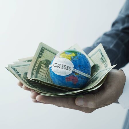 businessman holding a world globe with a protective mask, with the word crisis written in it, on top of a handful of dollar bills