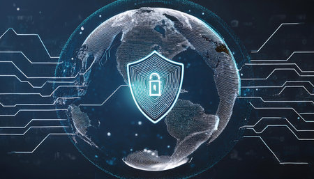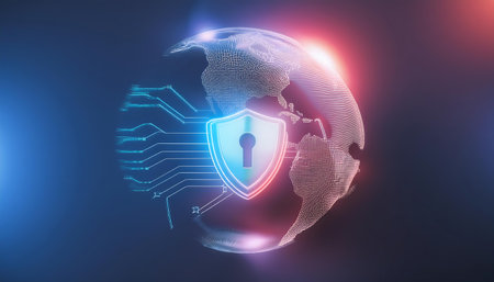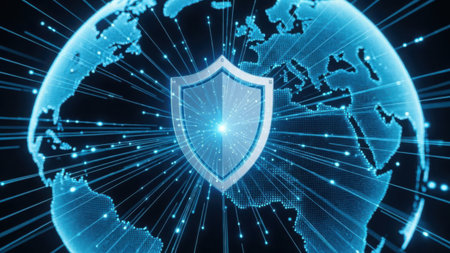 This image depicts a digital globe with interconnected lines and nodes, symbolizing global connectivity. At the center, a shield with a glowing core represents protection and security. The interconnected lines suggest a network of data or communication, emphasizing the importance of safeguarding global information systems.
