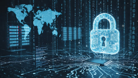 This image showcases a detailed view of a digital circuit board featuring a glowing lock symbol, representing the essential concept of cybersecurity and data protection in technology.