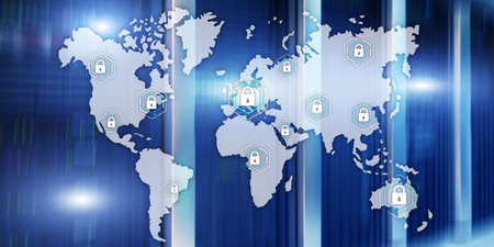 Global cyber security concept communication privacy data protection server room background.