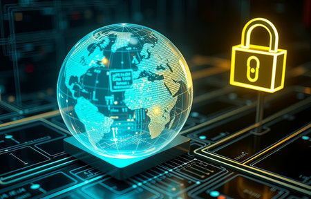 This image illustrates a digital globe featuring a security lock, representing the concepts of cybersecurity and data protection in today's interconnected world.