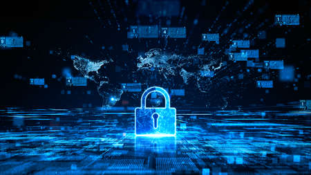 Cyber security concept with world globe and padlock. 3D Rendering