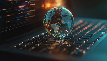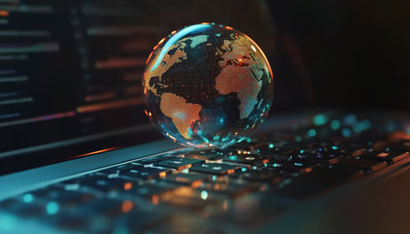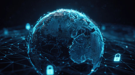An illustration depicts a glowing digital globe surrounded by numerous padlocks. The composition features a dark background, highlighted by the vibrant blue hues of the planet and security symbols. This visual could be used to symbolize global communication, information technology, and data protection in various commercial contexts.