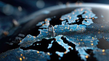 A striking visual representation of a digital lock positioned on a map of Europe, symbolizing the importance of data security and privacy in the digital age.
