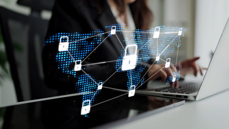 A network of glowing security shields connected across digital map.
