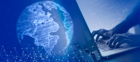 Global network concept with globe hologram on laptop keyboard for business and digital marketing
